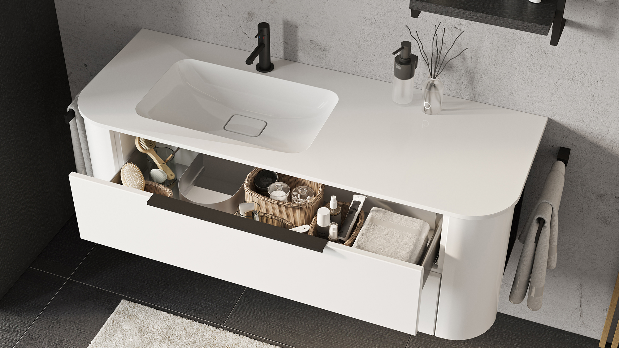 - Solid Surface / Mineralwerkstoff mit nahtloser, ruhiger Optik